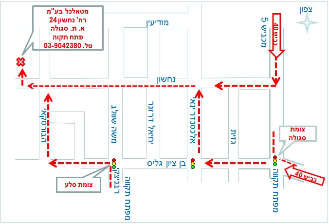 נוסעים לכיוון פתח תקוה ועוברים רמזור אחד, לפני הרמזור השני פונים ימינה לאזור התעשייה סגולה לרח' נחשון.